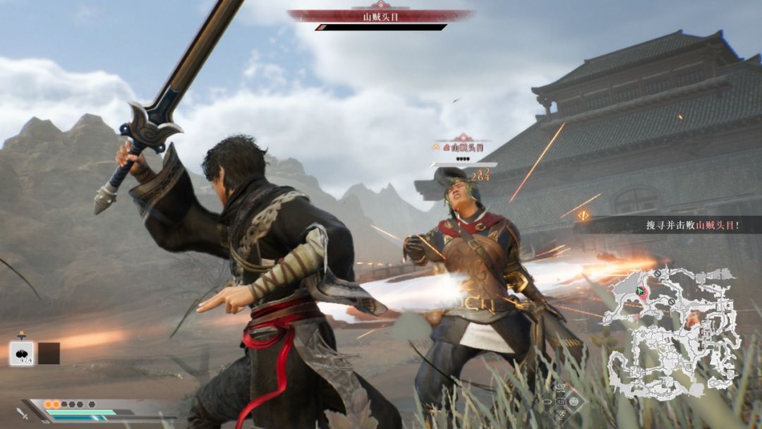 讲了这么多,我们对敌的方式主要攻击,完美弹反,防御,看破(完美闪避),化劲(特殊武技)。我方血条上方的豆豆为斗气,武技释放需要消耗斗气,防御在高难度下会消耗斗气。敌方血条上方的盾牌为护甲值。敌方的武器与我方大差不差,多了大锤和飞镖,扇子。虽然也不多但紧凑感营造得还是可以的。需要注意的是弹反的弹反帧会随游戏难度提高而缩短,我一周目最高难度玩的,弹反帧的把控主要就是敌方闪白光快要举起武器的一刹那按下lb