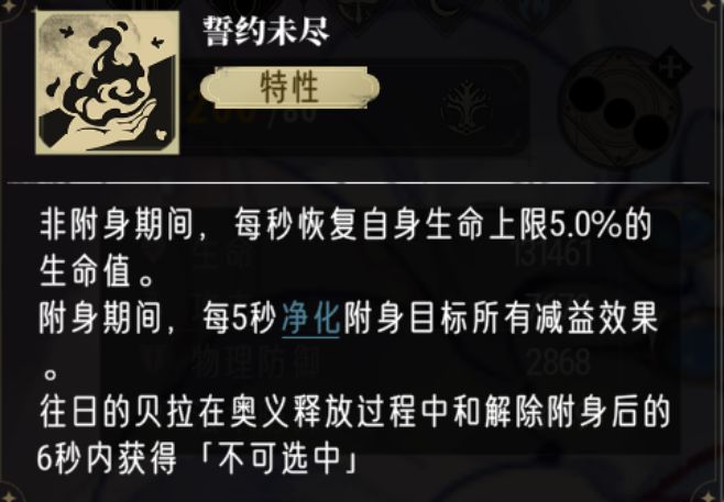 奥义释放后可给自身提供高系数治疗并附身指定单位,为目标添加45%全伤害提升、50%攻速提升,在附身期间可为附身单位提供自身25%基础攻击加成。