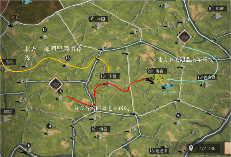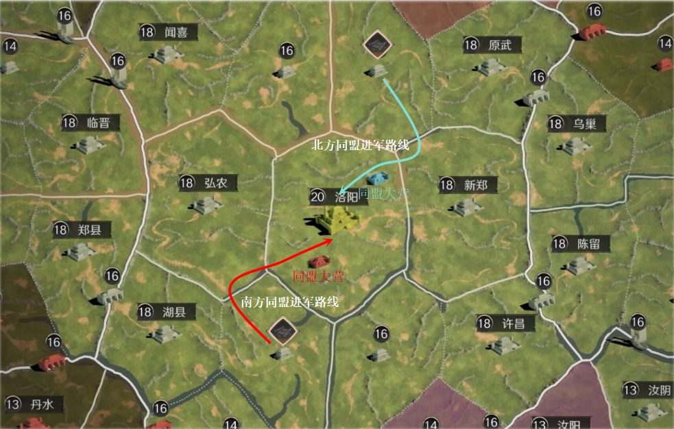 北方阵营问鼎盟优选「洛阳」、「寿春」重点争夺,南方阵营问鼎盟优选「洛阳」、「长安」重点争夺。直接攻打「长安」、「寿春」的收益较低,但仍然是可以选择的方案。