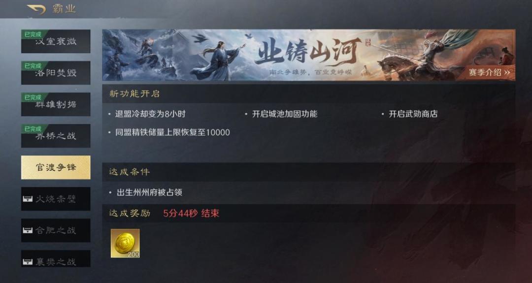问鼎赛季全新剧本「业铸山河」赛季精铁解封时间延迟到第6天中午(核心区开关),未解封前只能保存3000精铁,“关中、中原、淮南”均为耗铁重点区域,请注意路线规划。