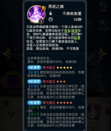 提升:引夜龙成功放逐敌方单位后(指移出战场),开始记录所有其他敌方单位受到的伤害,放逐的单位回到战场时停止记录,对其造成40%记录值的伤害