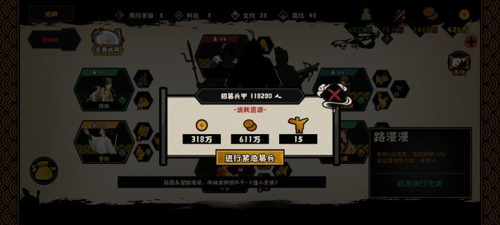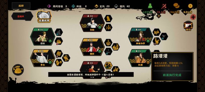 本来古诗玩得很嗨 但是灵犀不够用啊 地图上看到了岑总 出征就给两个灵犀缓解了科举的压力 直到魏征推荐了岑总的路漫漫 我的军规就下不来了 现在我已经不敢进去背诗拿诗意了
