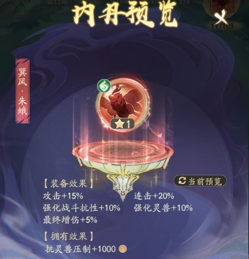 参战技能:间隔2回合释放1次技能,攻击造成主角攻击力增幅伤害,且提高主角强化治疗。内丹技能:灵兽行动后,每回合额外造成目标流血伤害,持续2回合。