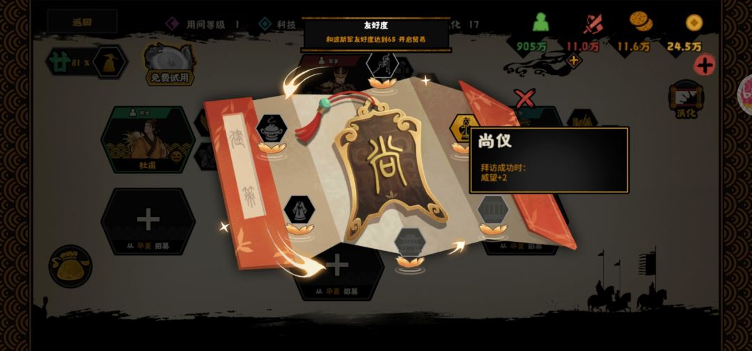 杜甫一个人就可以无限集诗刷属性应该是不差威望的(怎么集诗可以看我昨天发的攻略),接着是李靖的疑兵在打到对面首都的时候放,鬼谷子负责把对面首都周围的城池潜掉(我刚刚五级用间两次就把波斯首都周围的城潜掉了),独孤伽罗可以补行动力,她的尚仪也可以加威望(这个政策不一定出),所以可以把她换成加战力或用间的名臣,具体根据自己情况。最后对面的首都肯定要赢刚的,所以也要发展一下战力才能打。