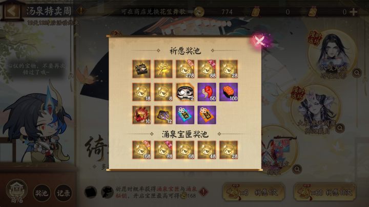 ※祈愿时有概率获得「涌泉宝匣」与「涌泉秘钥」。集齐「涌泉宝匣」与「涌泉秘钥」,即可开启宝匣获得额外惊喜奖励,最高可得「汤泉小判×168」!