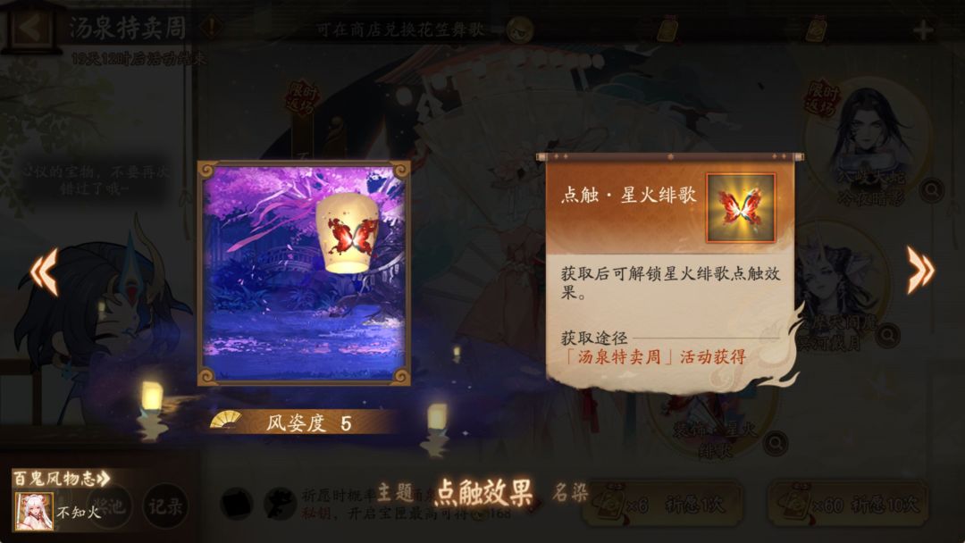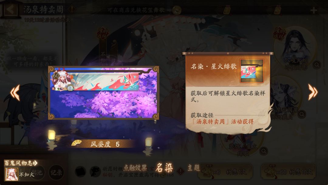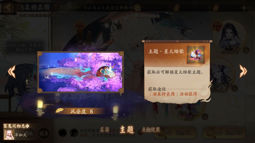 △活动介绍: ※活动期间,大人使用「御川福札」进行祈愿可获得「汤泉小判」等奖励。「汤泉小判」可用于兑换商店中多款限定外观,包含全新装饰「星火绯歌」及限时返场皮肤「不知火·花笠舞歌」、「八岐大蛇·冷夜暗影」、「大夜摩天阎魔·冥河戴月」等。