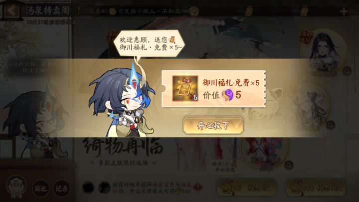 ※大人首次进入活动可获得5个「御川福札·免费」。每天参与逢魔之时也可免费获取2个「御川福札·免费」,活动期间最多可通过逢魔之时获得10个「御川福札·免费」!