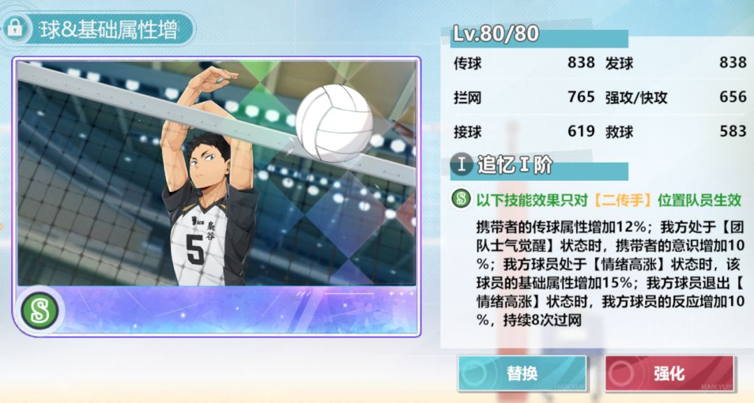 意识力量、接球拦网属性、强攻属性增幅:给扣球球员带来最多60%意识加成(强攻球员翻倍)、24%强攻属性加成、40%力量(强攻球员翻倍)加成(共鸣10),不处于士气觉醒状态时25%接球、拦网属性加成(共鸣6),每回合结束增加40点士气(共鸣6)。加成比较全面,但是力量、接球、拦网和士气加成都放在了共鸣里,本体只有强攻和意识增幅。