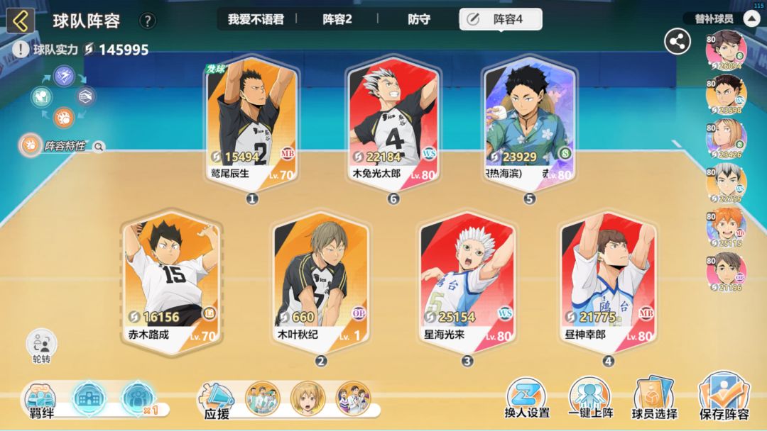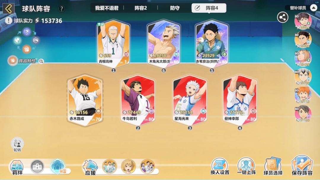 虽然青根还没出,但是3个海滨的羁绊还是很不错的,所以要给青根留一个位置。现有阵容鸥台双子是一定要的,强度很高,星海在前排有加成,木兔适合在后排。因为小红对强攻有额外增幅,OP推荐牛岛,自由人如果有高共鸣的西谷就用西谷,没有的话更推荐稻荷崎的自由人赤木路成,可以加士气和扣球球员的进攻技巧,非常适合这个配队,以后可以换成古森元也,也会比SP西谷更适配海滨队。