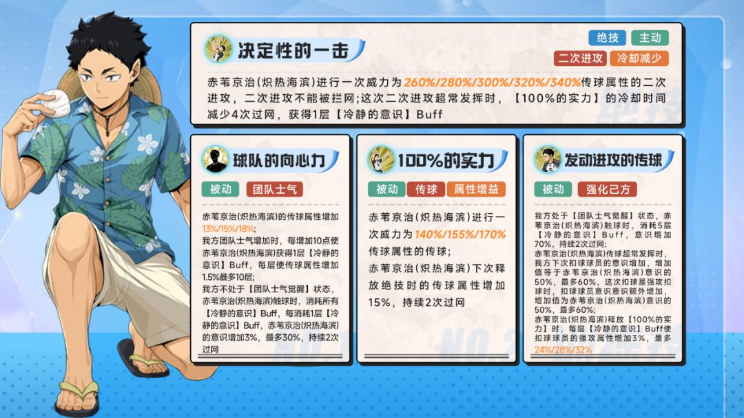 赤苇京治(炽热海滨)进行一次威力为260%/280%/300%/320%/340%传球属性的二次进攻,二次进攻不能被拦网;这次二次进攻超常发挥时,【100%的实力】的冷却时间减少4次过网,获得1层【冷静的意识】Buff;