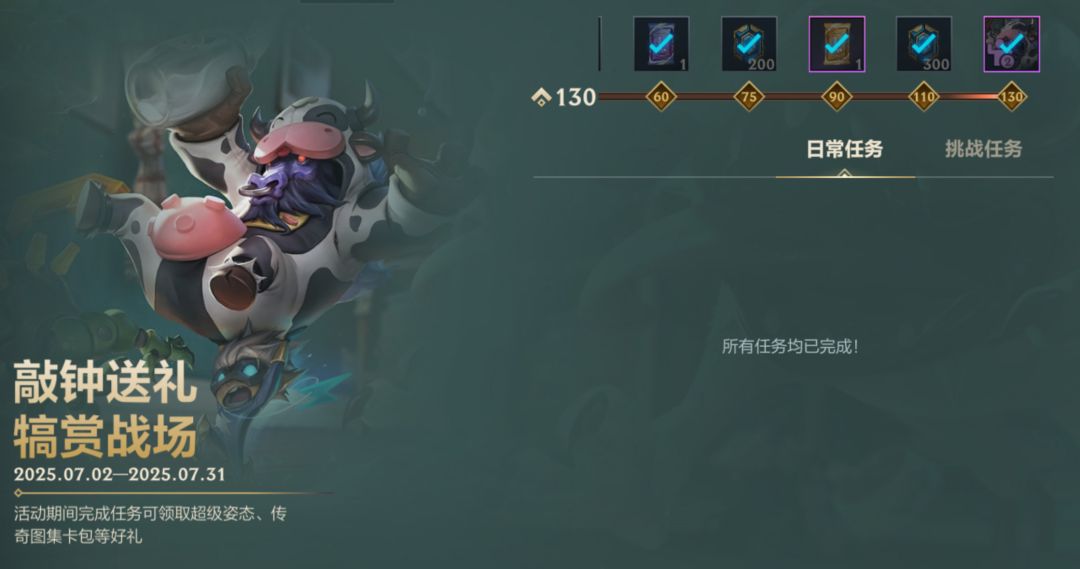 截止至7月31日,召唤师完成活动任务,就能领取“哞利斯塔 阿利斯塔”超级姿态-两军交战 不斩乐师、传奇图集金色卡包、传奇图集紫色卡包、集萃晶石好礼!