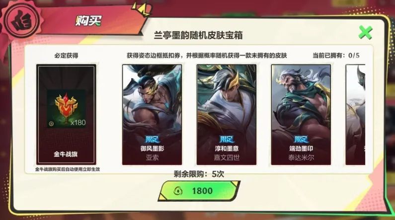 当翻出宝箱时,单个宝箱可购买多次。购买宝箱即可获得英勇战旗-金牛战旗(180天),并随机获得一款宝箱内未拥有的皮肤。