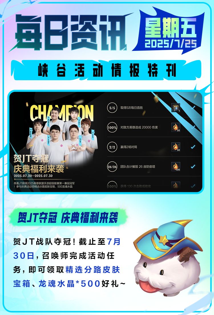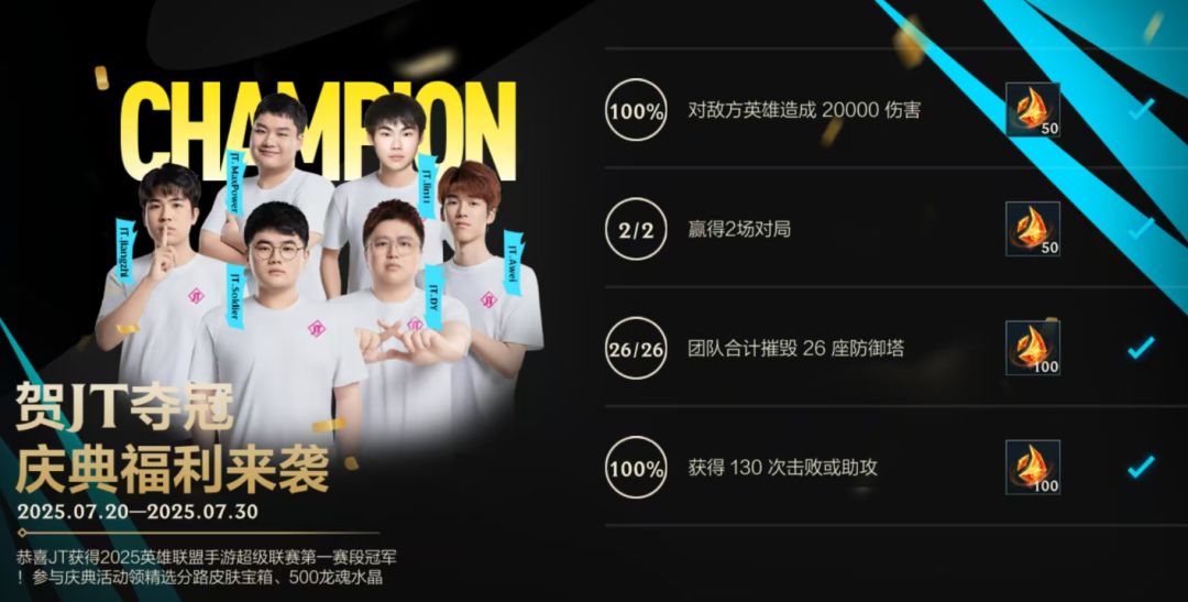 恭喜JT战队获得2025英雄联盟手游超级联赛第一赛段冠军!截止至7月30日,召唤师完成活动任务即可领取精选分路皮肤宝箱、龙魂水晶*500好礼~