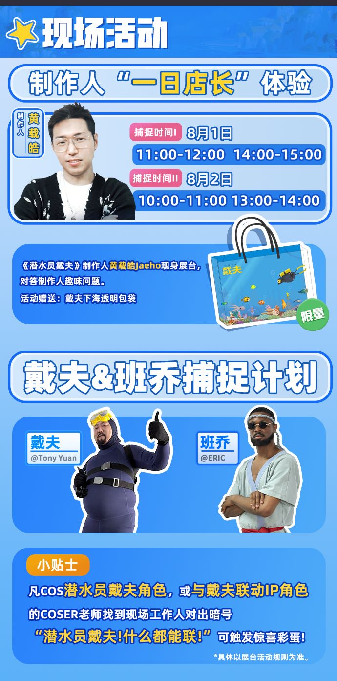 以及,我们还为现场的Coser老师准备了特别活动。凡是COS潜水员戴夫的角色、或是戴夫联动IP角色,找到现场的工作人员,喊出暗号“潜水员戴夫,什么都能联!”,可以触发惊喜彩蛋掉落。