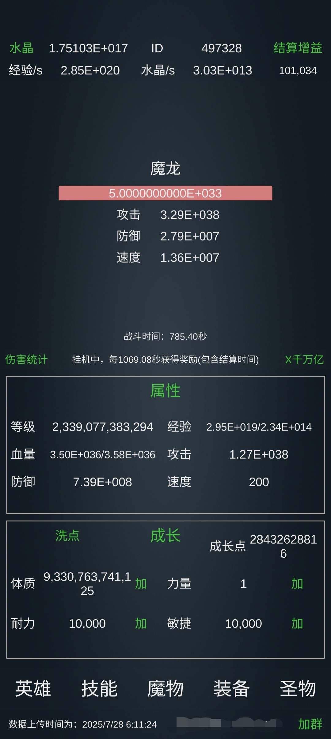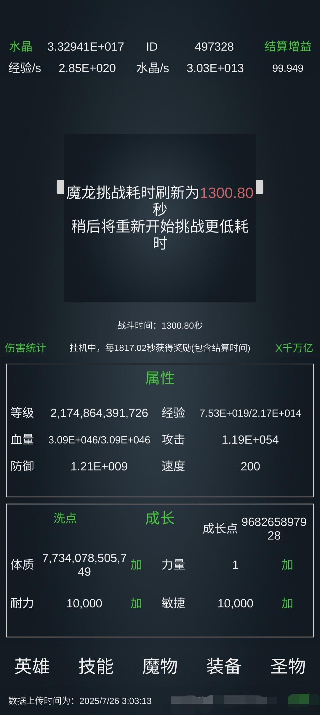 装备:开局1545附灵,当防御涨到5、6千万以上后,就可以开满附灵了,这个操作基本能在2千秒内通关。