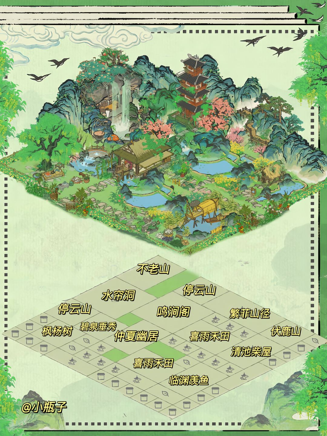 主要建筑:不老山,水帘洞,停云山,鸣涧阁,繁菲山径,枫杨树,碧泉垂秀,仲夏幽居,喜雨禾田,伏鹿山,清池柴屋,临渊羡鱼。