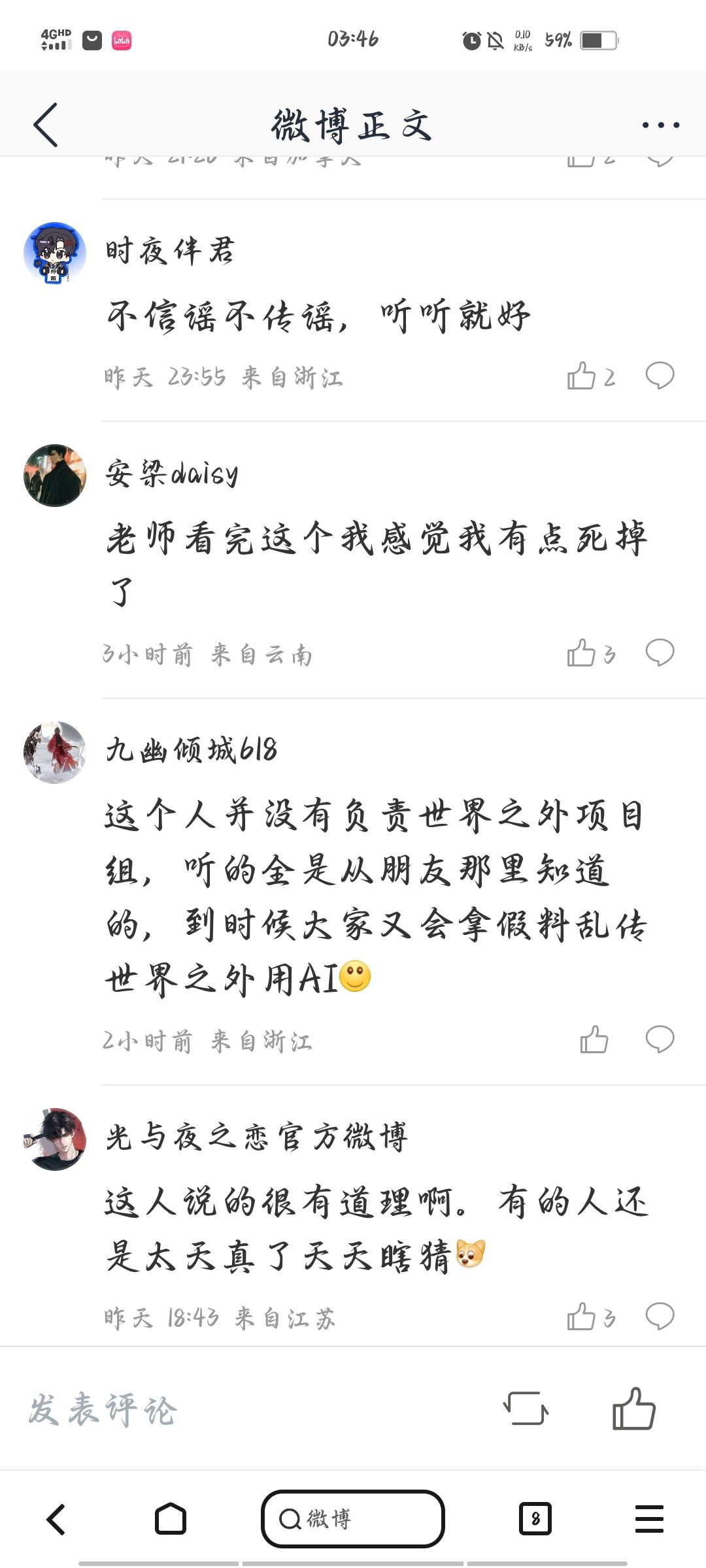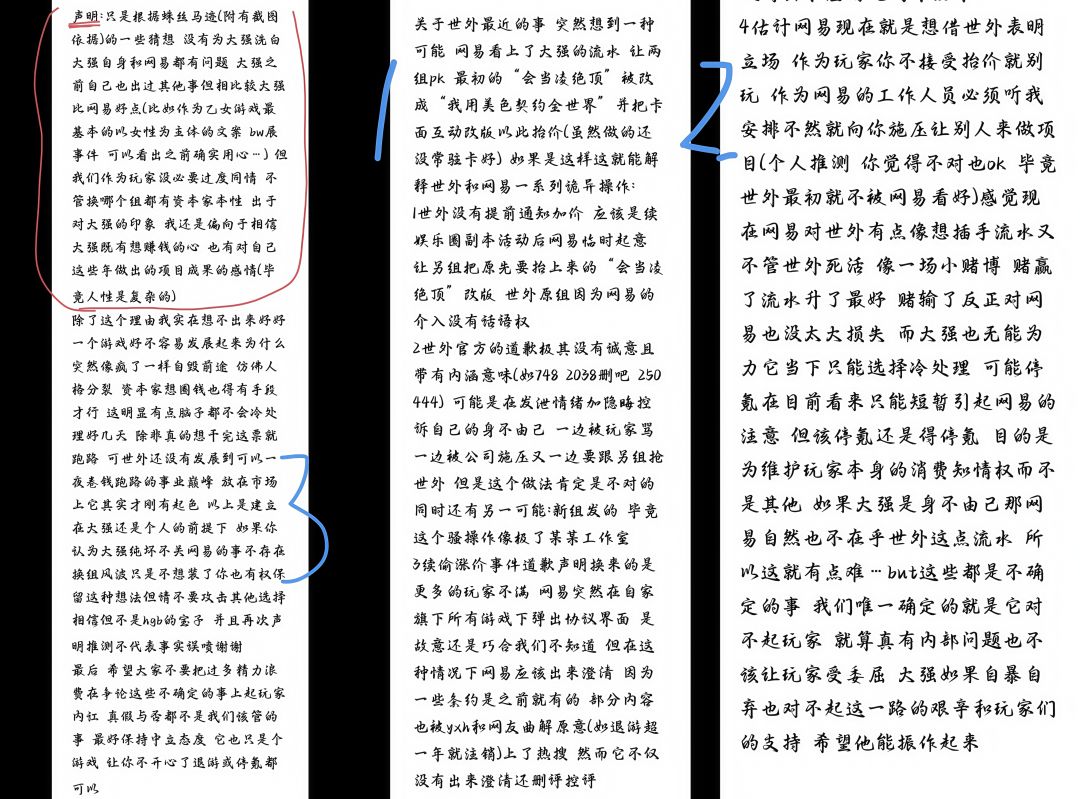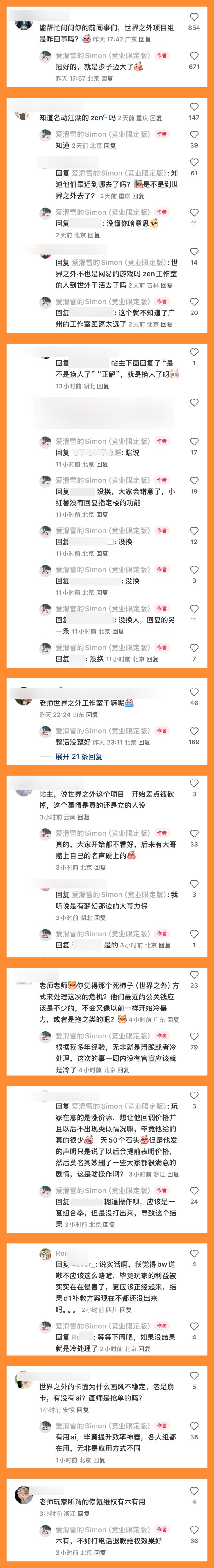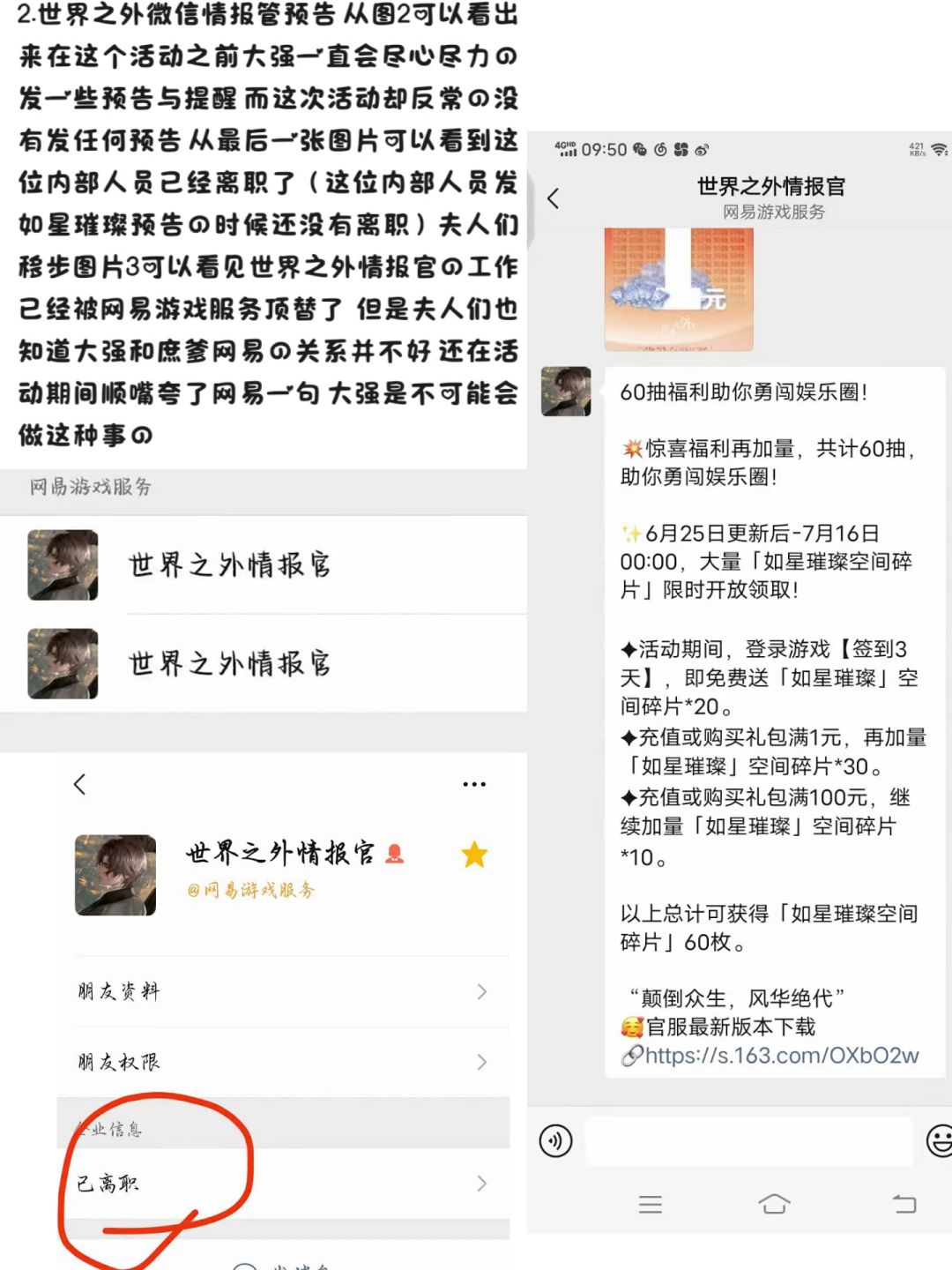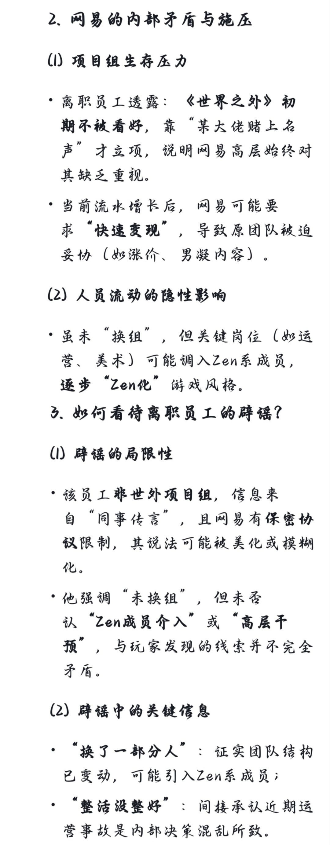 二编:看到有网易工作者出来辟谣了(如图)还是有些震惊的 因为官方群里的管理员确实跟哈利波特相关还有大强的ip变化 唯一解释的上的就是情报官可能是正常人员流动(注意他回答的是他不知道zen工作室的人有没有去世外工作因为世外在广州距离太远 但是他肯定了世外组内没有换人 什么意思呢大概就是世外核心成员没有变zen也没有接手新项目 不存在两个组pk 但是因为物理距离不清楚zen成员有没有去世外工作(接手和换组有官方消息 但zen成员有没有去世外工作官方不会给出消息)并且评论区也说了这个人虽然是wy工作人员但不是世外项目组很多是听朋友同事说的没有做到很客观 如果那张官方群截图信息来源是真的我能想到的就是zen成员去了世外加上世外自己组内的内部矛盾(对应大强一直时好时坏)可是组内的人员里还有多少是有真心的呢 在wy这样⭕米的环境里 守住初心的人实在太难得了 wy的施压大概率也存在 但发生这一系列事也有很多世外自己的问题 写下这段话其实心里还是有些难过 我是从开服就看着它成长的 中间不是没有发生过问题 所以我从未想过要洗白但希望你是被迫抬价 如今这些其实都不重要了 你确实实打实伤害了我们 对此我只能说 我会记住最初的你 但你不是突然烂掉的