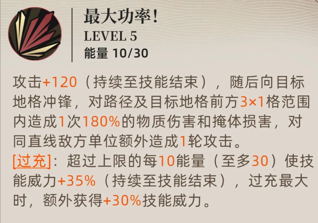而当能量达到效果上限的60点时我们再使用此技能,“护甲穿透+75%”的持续时间便会延长到3回合,这个也是“过充状态”在1技能上的增益表现,客观说75%的护甲穿透,外加一些从各种配件等渠道获取的额外护甲穿透,白星在攻击高防御敌人时的威力会非常显著。