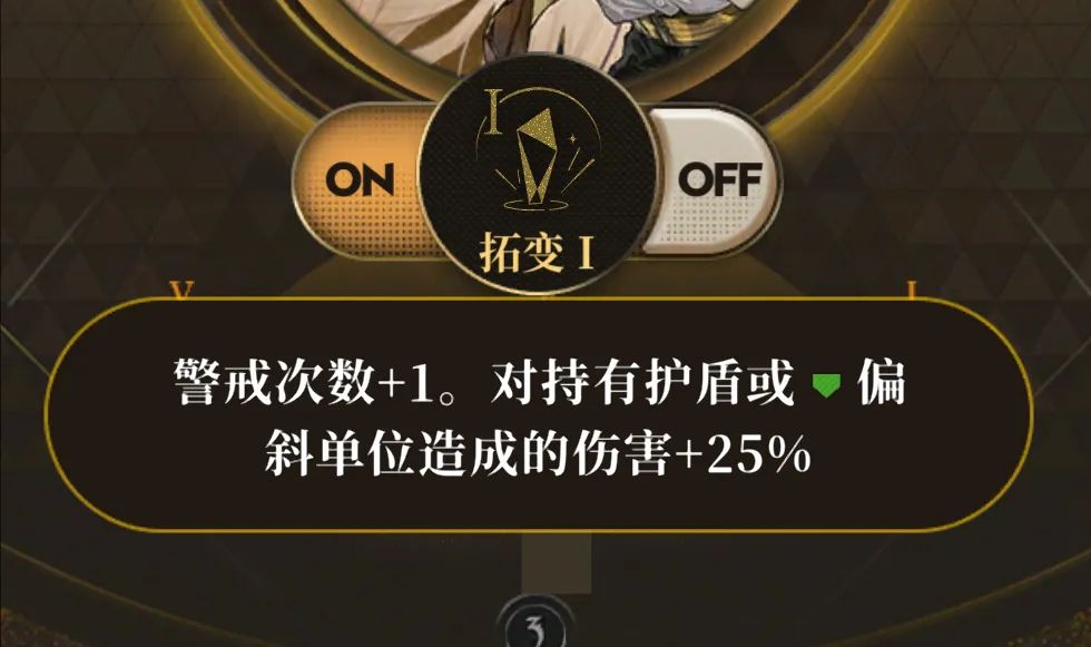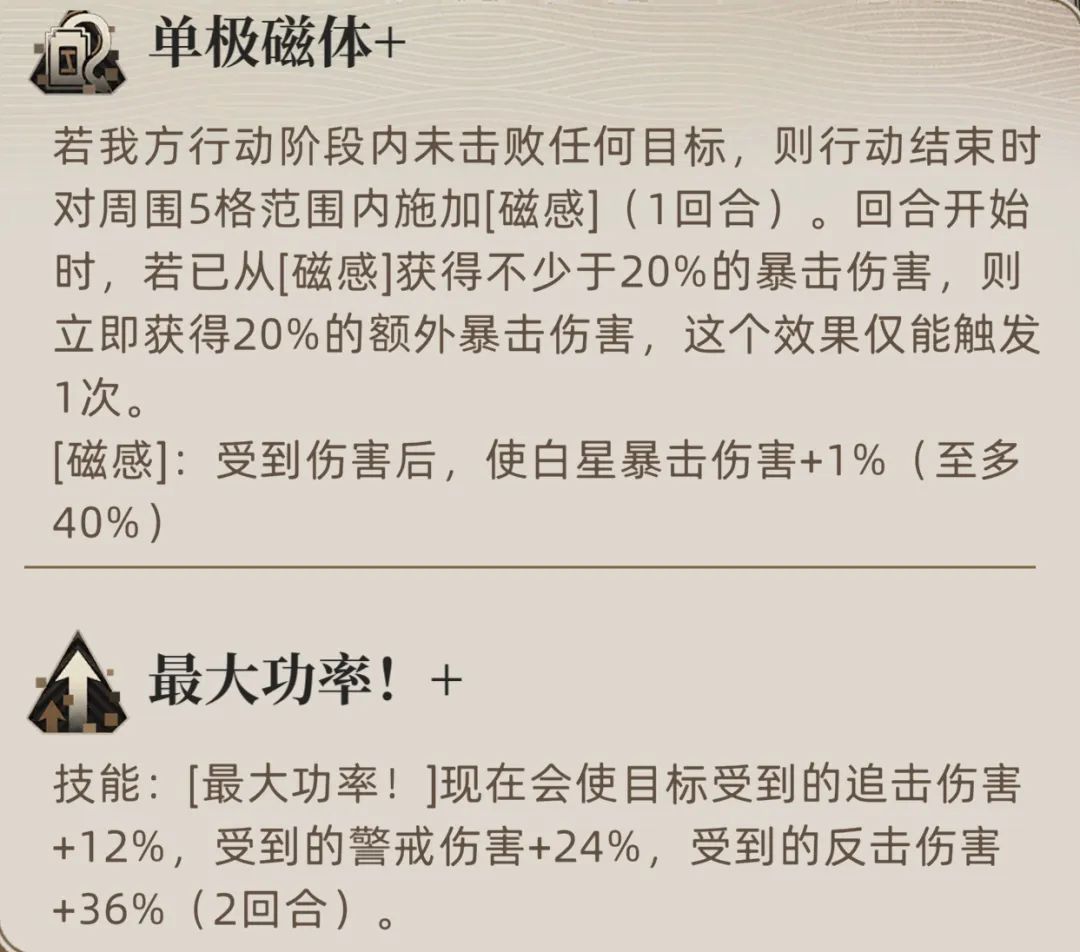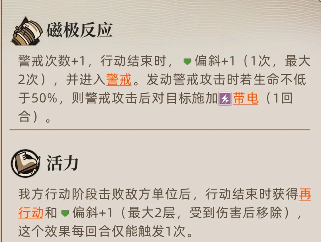 接着白星也继承了刀锋职业一贯以来的“警戒”和“击杀再行动”功能,此外白星的警戒也可以给对方施加“带电”。此外行动结束时和击杀敌人后都可以给自身施加偏斜,这也有利于白星封装体天赋效果中施加“带电”状态的触发。(第1回合就想触发的话,需要小兵辅助或者3拓变)