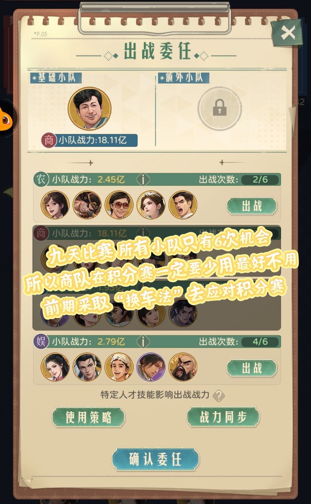 商、文、农、娱在这九天的活动里面,所有小队每个人都只有6次使用机会,所以我们要合理安排每个小队的使用次数。