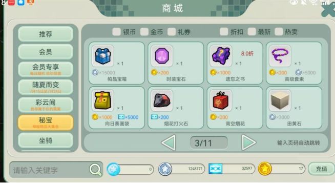 这一步我们需要点击左上角商城,然后点击秘宝,根据需要抓捕的宠物;来选择所需要的套索为普通套索还是高级套索。