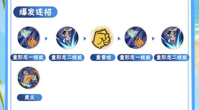 重形态下释放一技能召唤重海螺,二技能命中重海螺打出重重追加技,继续普攻连段,待一技能冷却好后释放一技能召唤重海螺,再释放重形态二技能继续输出,最后释放奥义打出高额伤害。