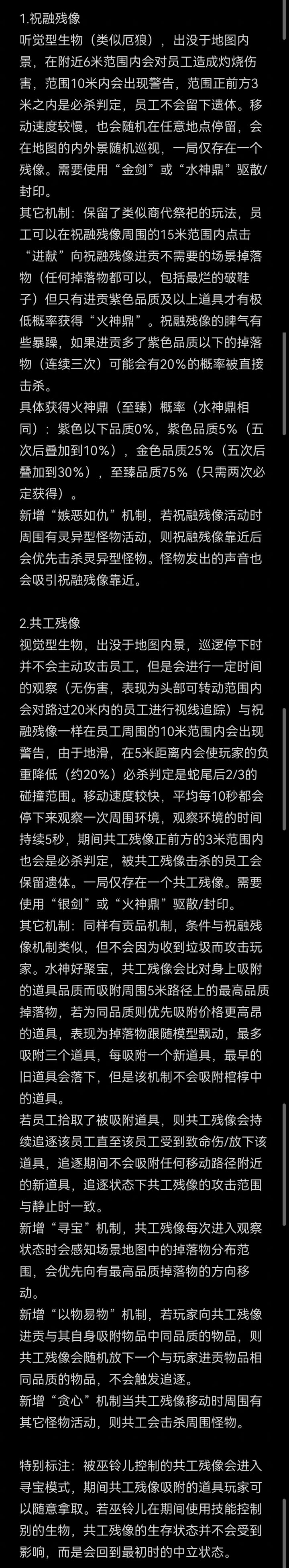 祝融残像与共工残像若在空旷房间相遇会发生短暂冲突,一局仅触发一次,若员工不幸在同个房间内会受到致命伤害。