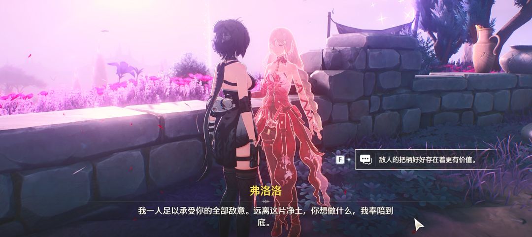 再比如后日谈中,主角进入弗洛洛创造的世界与其见面后,前者将世界比作「敌人的把柄」;后者则认为主角是「未受邀请之人」——可见双方之间依旧是立场大于情感(不排除赌气因素)。
