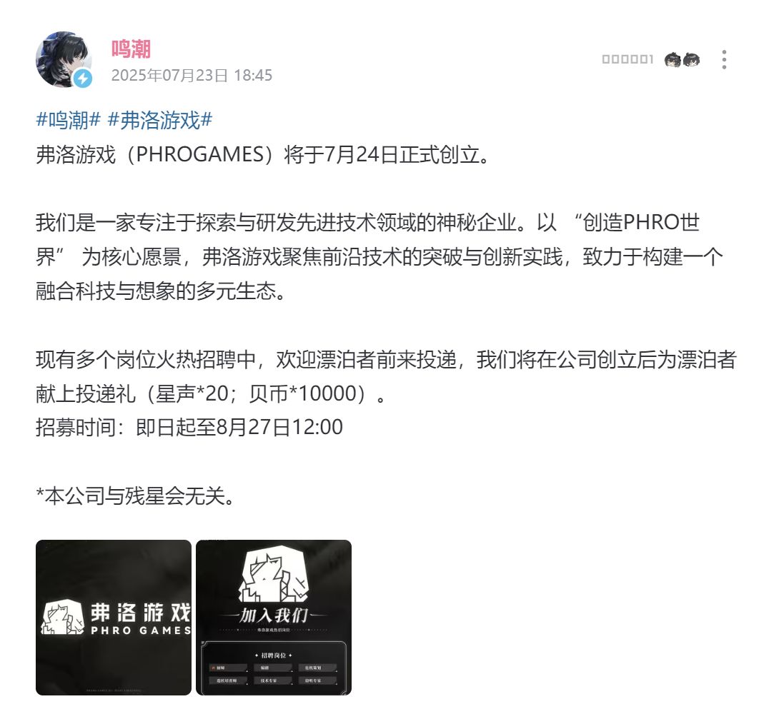 在外部侧,库洛也为其配备了高规格的宣发物料。甚至版本上线的前一天,库洛游戏还亲自下场玩梗,化身「弗洛游戏」公开招聘,可见他们对该角色的重视和喜爱。