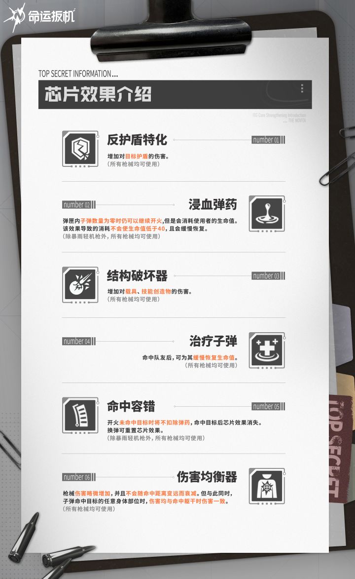 本期将带来另外6款枪械芯片的介绍,它们分别是:反护盾特化、浸血弹药、结构破坏器、治疗子弹、命中容错、伤害均衡器。