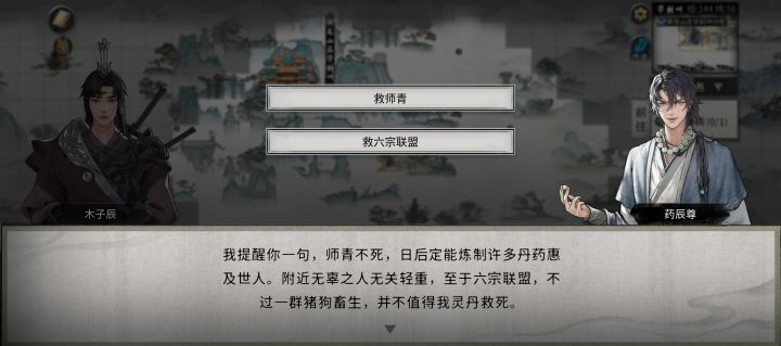 然后让你中毒减体力上限,之后可以在师青那里解毒并获得丹方,最后两个人还是打架,但是帮助的是师青。打完后师青为了六宗自己吃下毒药,你可以选择喂解药给师青或者六宗,喂给师青后师青就可以活了