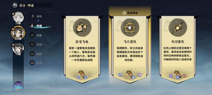 2.神通:带飞火雷岚➕天闪雷岚(打什么都不用换),其他的带荡雷 神霄雷罚 囚灵雷狱过图。