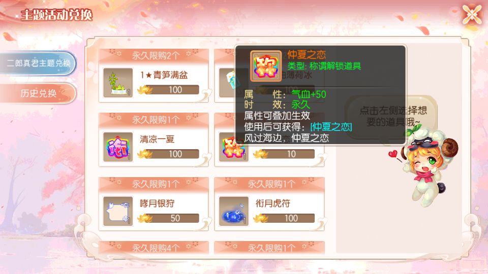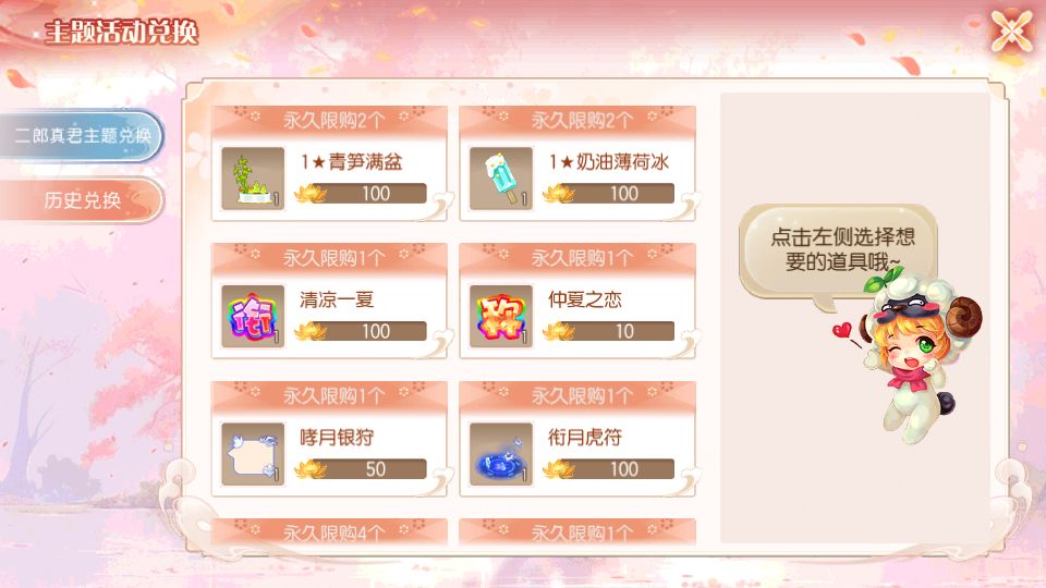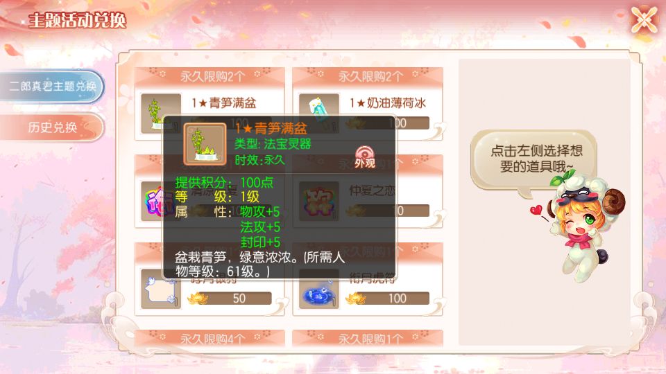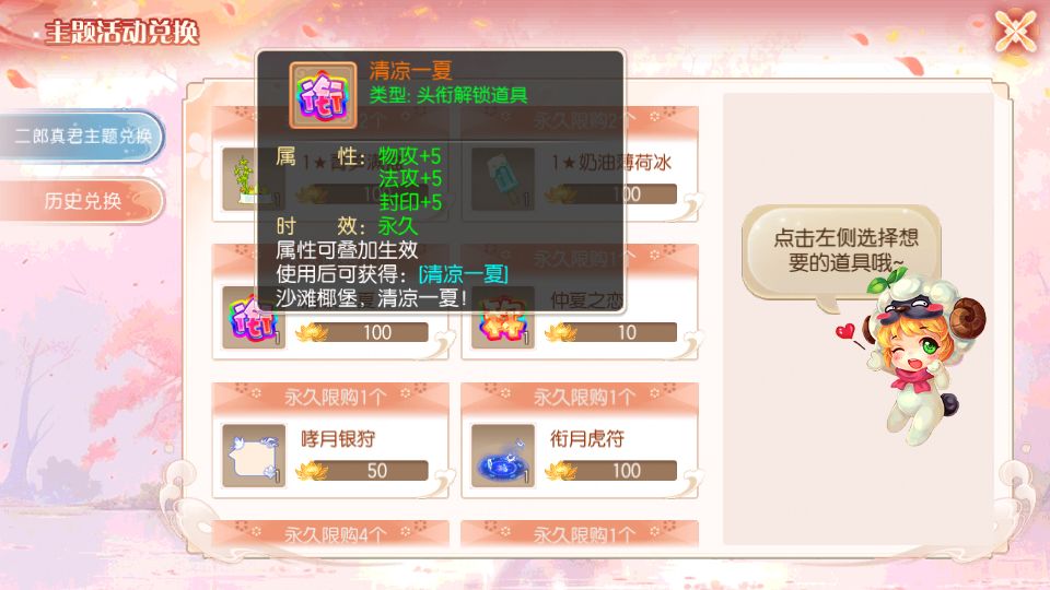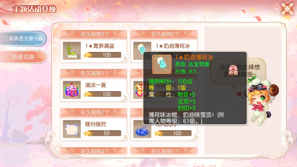 在这次版本更新中,二郎真君主题兑换新增了四个兑换道具,分别是1星法宝「青笋满盆」、1星法宝「奶油薄荷冰」、头衔「清凉一夏」和称谓「仲夏之恋」。