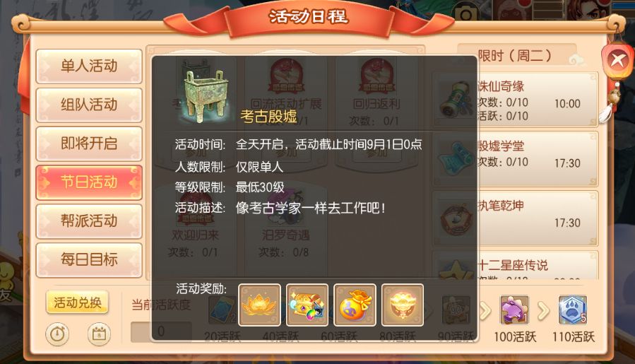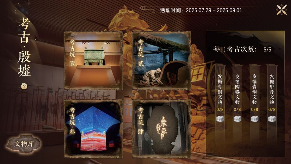 7月29日-9月1日,等级≥30级的少侠可以单人参与【考古殷墟】活动。在活动中,少侠们将参与到殷墟的考古现场中,进行文物的发掘工作。