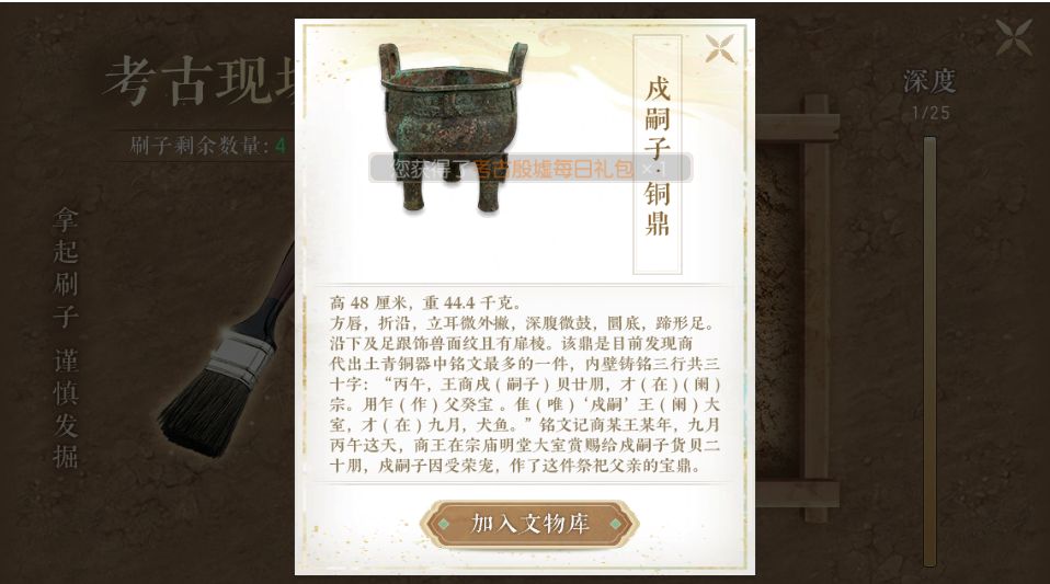 每天少侠会领到5把考古刷,每次进行考古发掘将消耗1把刷子。每次发掘都会有机会发掘到殷墟文物,发掘到文物时可以领取到奖励。同时如果集齐全部品类的文物,可以领取丰厚的累计奖励。