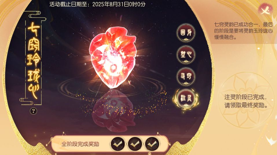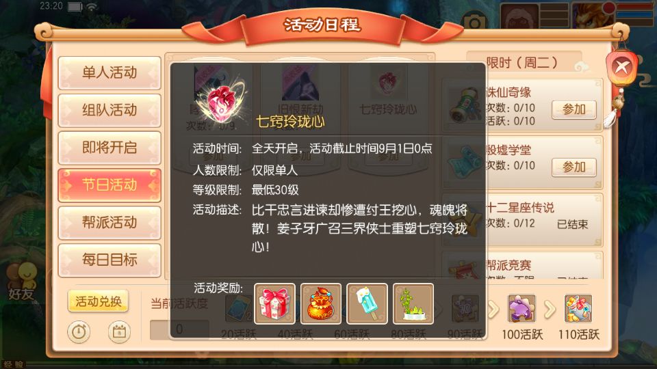 7月29日-9月1日,等级≥30级的少侠可以单人参与【七窍玲珑心】活动。少侠们每日在【七窍玲珑心】活动中可接取并完成三、四个日常任务,完成日常任务可获得当前阶段的贡献值,当贡献值达到一定数量后即可触发当前阶段的阶段任务。完成阶段任务会进入下一阶段直到四个阶段全部完成,并收获丰厚的奖励。