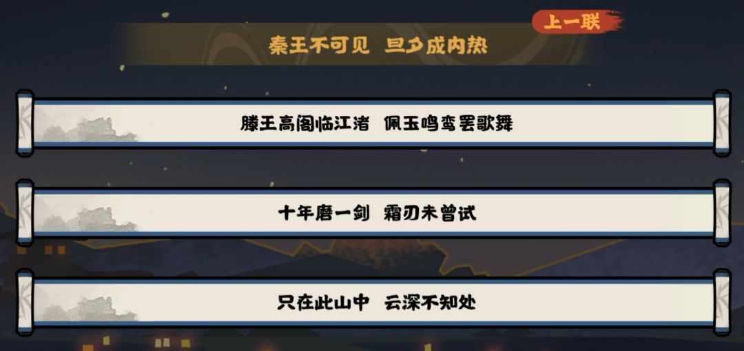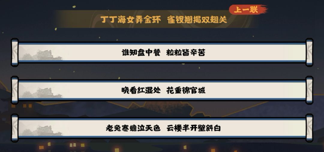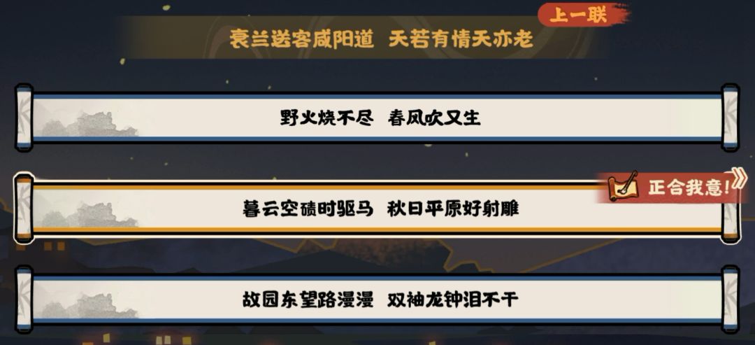 下面做个例题,上一联的句末是【老】,韵母为ao。第二个选项句末是【雕】,韵母为iao,和ao同属第六组,所以就达成押韵了。但和相粘不同,平仄只有两类,而韵母有十四组,所以很难押到韵。为此游戏放宽了限制,除了押韵和出韵外,在韵母发音接近的情况下,还有一种既不算押韵也不算出韵的结果。