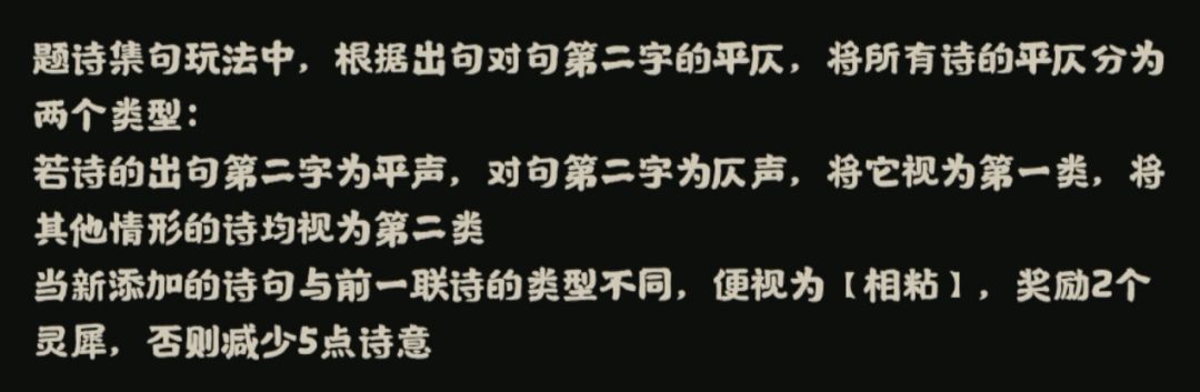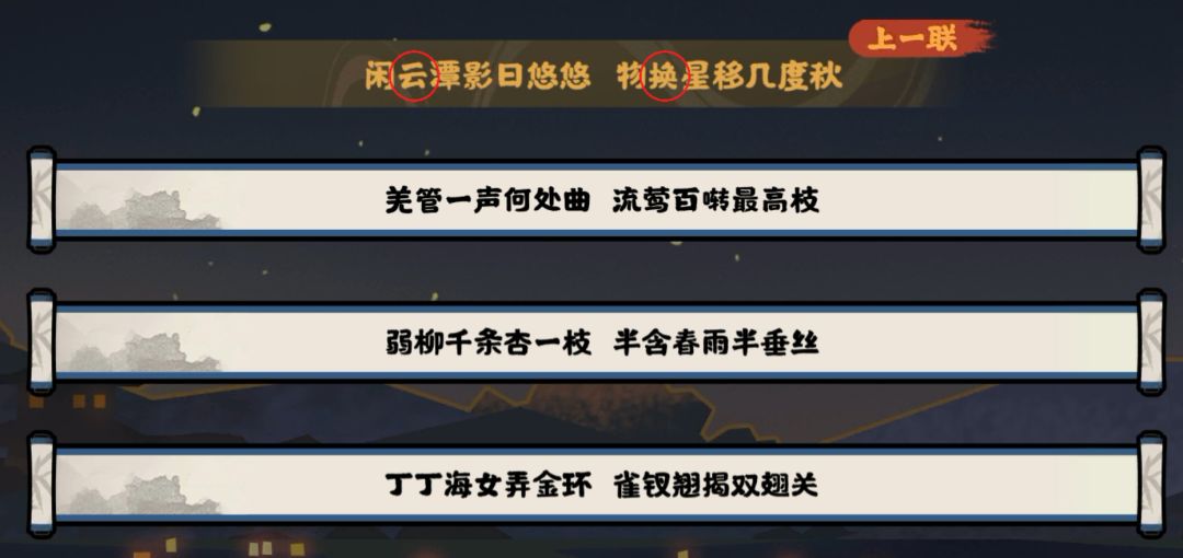 先说相粘,达成相粘可以获得灵犀+2,否则就会诗意-5。相粘的要求是两联诗的平仄类型不同,而平仄类型看的是出句和对句第二个字的平仄。比如在这联诗中,看的就是【云】和【换】。而平仄可以按照我们拼音中的4个声调来判断,一声二声为平,比如巴bā和拔bá,三声四声为仄,比如把bǎ和霸bà。这联诗中,【云】是二声为平,【换】是四声为仄,所以这联诗的类型就是平仄。诗联类型一共就两类,平仄是第一类,仄平、平平、仄仄都归为第二类,由于出句和对句的平仄往往是相反的,所以平仄和仄平比较多,平平和仄仄很少。这联诗的类型是平仄,属于第一类,所以我们要找个第二类的来达成相粘。