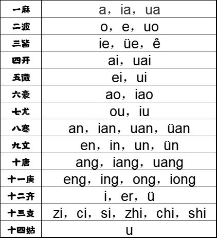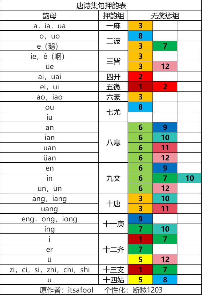押韵的规则不难懂,两联诗的句末用同一组韵母的字就算达成押韵。游戏采用的规则是中华十四韵,也就是有十四组韵母,但规则里只标了12组,所以我重新做了个表优化了一下。这里需要注意的是十三组的zi、ci、si、zhi、chi、shi,虽然也是i结尾,但和十二组的i并不能押韵。