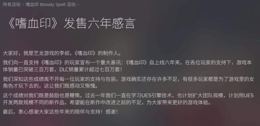 7月27日,《嗜血印》官方宣布,游戏上线六年来本体销量突破300万套,DLC累计销量超700万套!