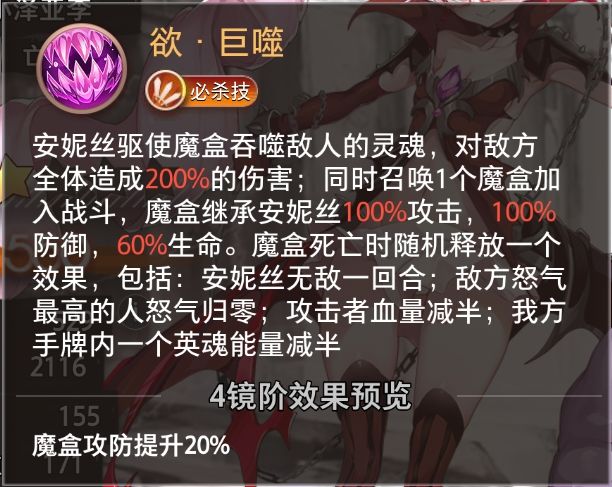全屏攻击(200%攻击伤害)并召唤魔盒,魔盒继承安妮丝100%攻击和防御。镜阶4提升魔盒20%攻防,建议优先升满。