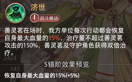效果:在场时,我方单位每次行动(普攻、怒攻、技能)均恢复自身最大生命值的15%,治疗量上限为善灵茗攻击的150%,且自身及守护角色获得双倍治疗。