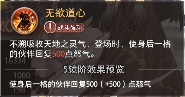 被动·无欲道心:登场为后排回复500怒气,依赖队友配合,自身缺乏输出能力。