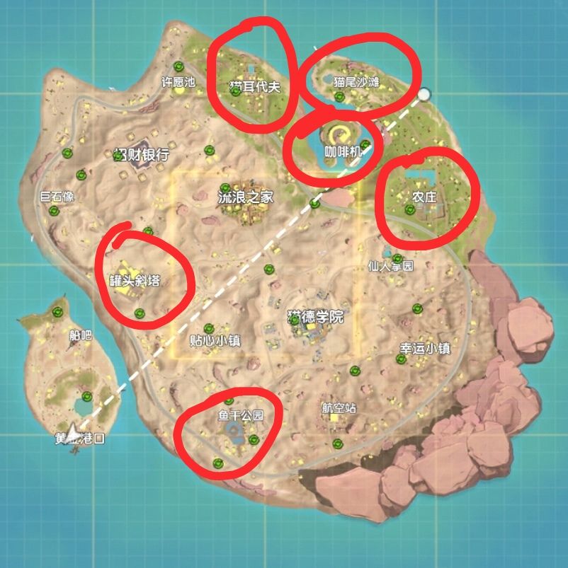 1.跳一下红圈内的点位,我通常是跳农庄,但这个航线农庄在头,人可能比较多,所以跳罐头斜塔/鱼干公园。这些点位不仅仅人机比较多,更主要的是,周围都有载具刷新点,即使有敌人攻过来,也可以快速逃离