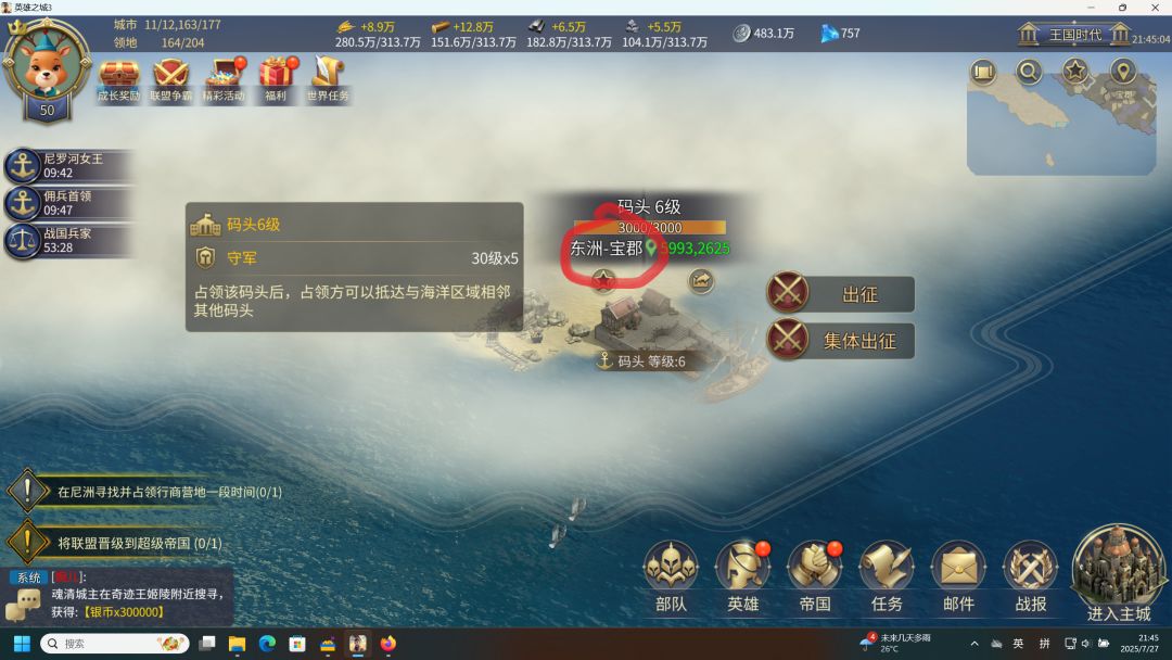 如果你想知道自己处于哪个洲,可以随意点击附近的城池,或者资源,会看到相关信息。