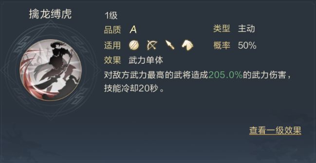 “千里单骑”——针对性输出+控制技能。该技能会对敌方最高武力的两名武将发动武力伤害,并有五成几率施加缴械效果。伤害和控制并重。