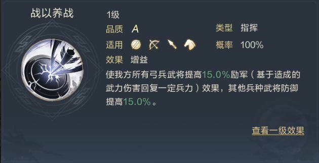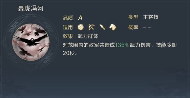 “威震华夏”——单体输出+减属性技能。单体伤害的同时还将扣除对方武将的武力及防御属性。
