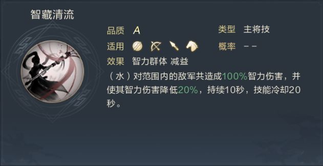虽然该技能只是一个B级技能,但是也代表其获得的容易度。给予我方其余武将智、武双属性加成,CD也只有10秒。更贴合我们的于吉+关羽+主公一智一武一辅助的前期阵容。