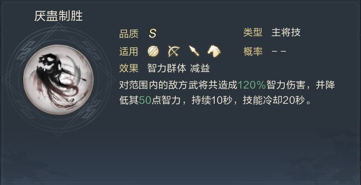 “厌蛊制胜”——范围智力伤害+降低范围内对方武将属性的技能。