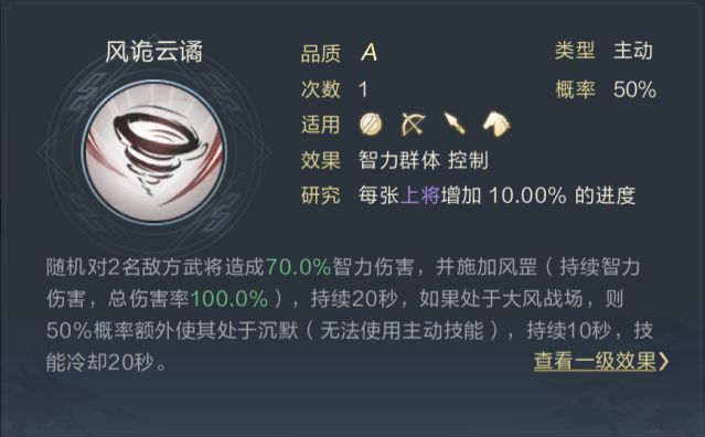 这是一个智力型伤害+持续伤害技能。并且如果处于大风天气下的战场,还有5成几率的沉默效果。本质上是一个伤害技能的同时还带有限定控制效果。同样加强了于吉的持续伤害能力,并在一定程度上补足了于吉的控制能力。